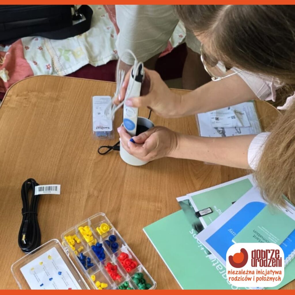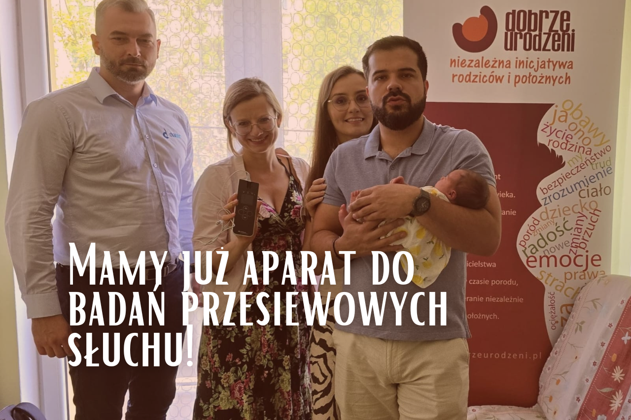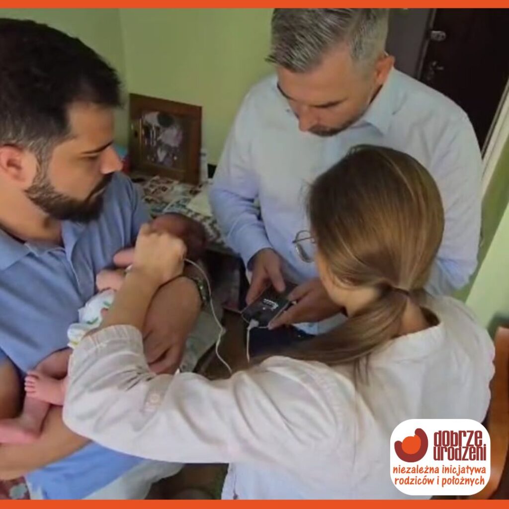 Udało się to zrobić bardzo praktycznie – zaprosiliśmy Rodziców p.p. Magdę i Mateusza wraz malutką Zosią, urodzoną w domu niedawno, bo 14 dni wcześniej, na badanie przesiewowe i przetestowanie aparatu. I już wiemy, że Zosia słyszy ❤️